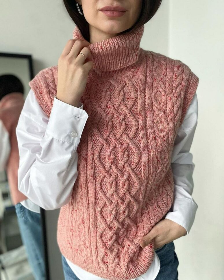 Вязаный спицами жилет нежно-розового цвета привлекает внимание своим объемным узором араны и высоким воротником-стойкой. Эта модель без рукавов становится идеальным дополнением к рубашкам, подчеркивая текстуру сложного плетения. Использование аккуратных боковых линий и мягкой фактуры пряжи с мелкими вкраплениями цвета создает гармоничный образ, который будет актуален как в повседневной, так и в более формальной обстановке.