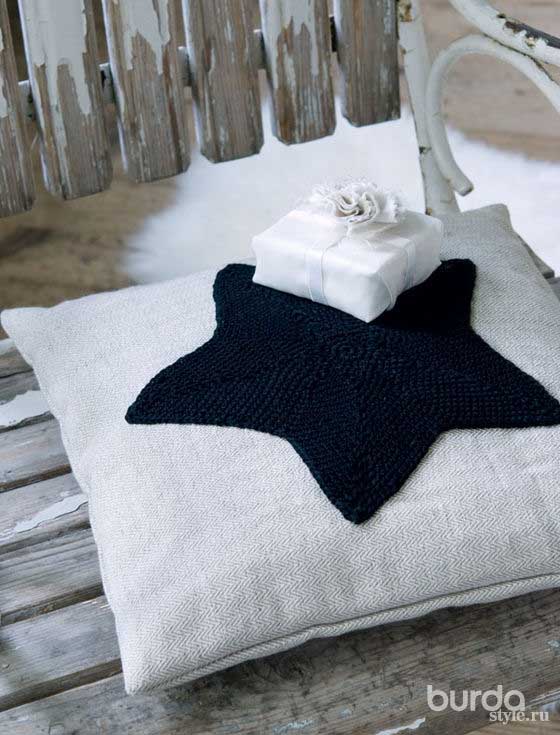 На льняной наволочке выполнена аппликация в виде звезды, связанная крючком из хлопчатобумажных ниток. Эта работа не только украшает пространство, но ...